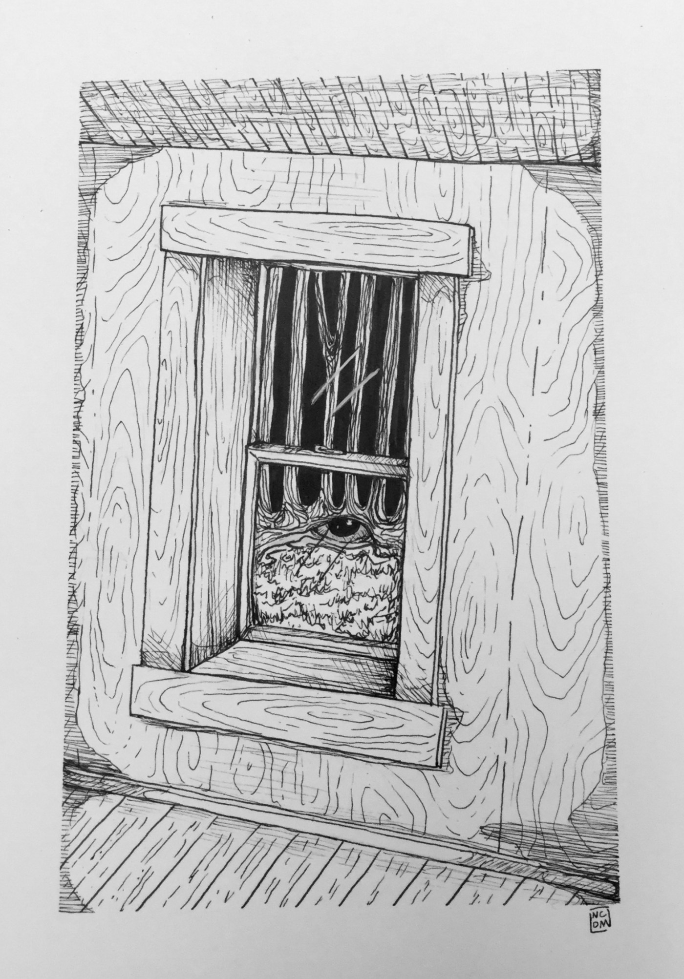 Outside the window, across the yard, is the forest. The forest watches me, and sometimes I go out in it. In the forest there are many dead trees and in the trees are birds and among the trees is a hill. The hill was left here by a glacier long ago.