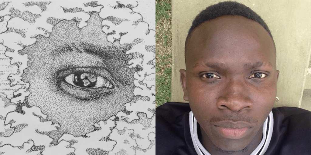 For today’s piece, I used pointillism to render Kennedy’s eye because I was inspired by all the little things that connect us. Kennedy took a photo of himself for me, and it inspired me to draw his eyes resting in the clouds. In the photo, he is lying on the ground, looking up, and reflected in his eyes is the phone he holds above him, and behind the phone the sky.
