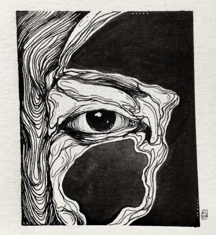 Humany-Animaly culture: Inspired by Ed Yong’s article “Chimpanzees Are Going Through a Tragic Loss” India ink on paper The genetic connections between humans and chimpanzees, whether they be our approximately 99% shared DNA or our cultures, remind me that some of the most human traits we possess are also some of our most animalistic. At…