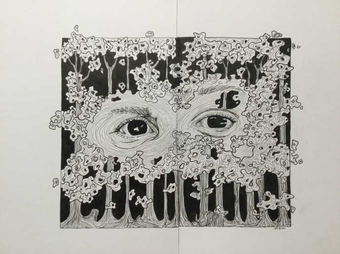 Two Parts to a Whole: #1 In the Treetops Ink on paper Within CognEYEzant:365 are works that belong together: fit into a larger whole. This is the first. “Two Parts To a Whole” is a series of drawings–they come in pairs. “#1 In the Treetops” was inspired by a childhood surrounded by trees and the…