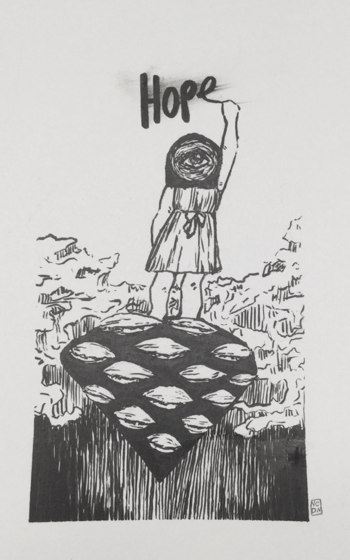 Hope: Inspired by the Work of Abu Malik al-Shami Ink on paper On October 13, 2016, the BBC published an article about a Syrian student turned soldier turned artist. Abu Malik al-Shami was still a teenager when the war in Syria began. At the time of the article, Shami was only 22. Amid the devastation,…